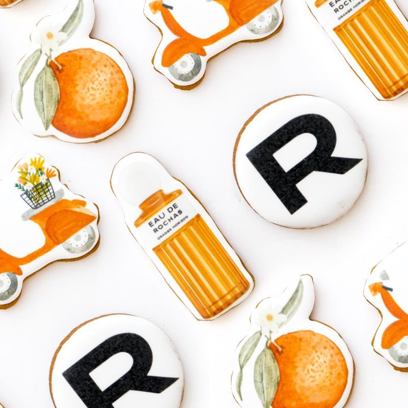Nous créons une illustration aquarelle originale pour votre marque ou événement, puis l'imprimons sur biscuit. Un résultat unique.